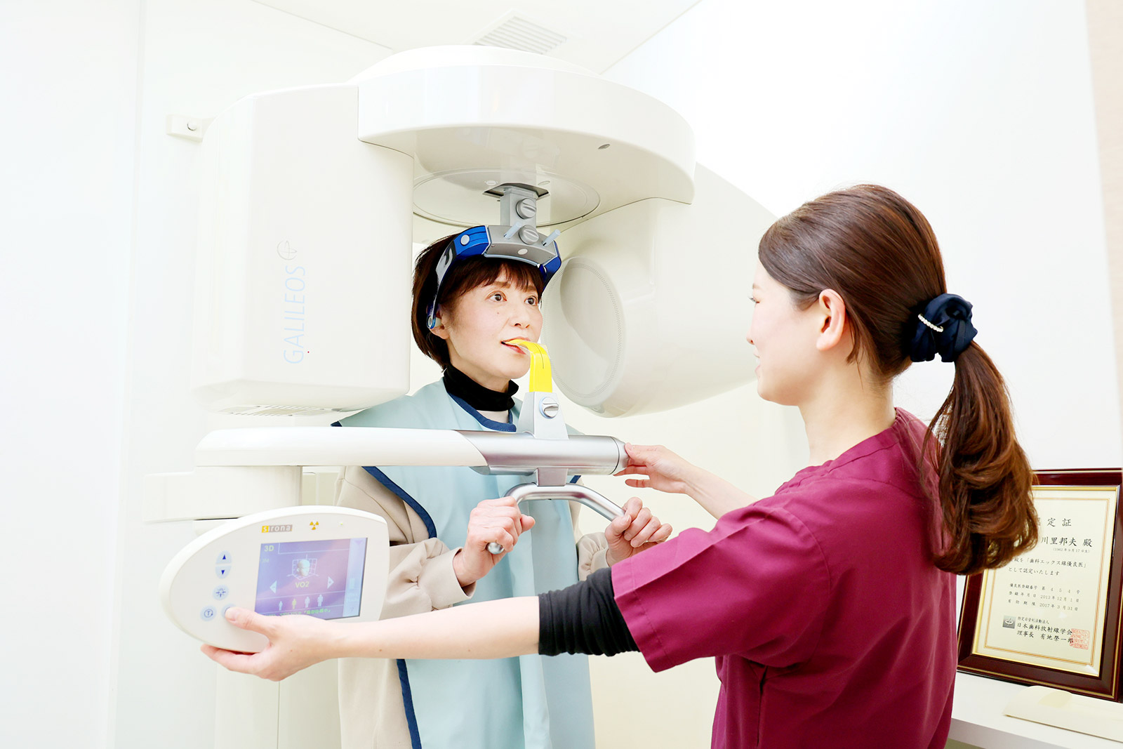 CT(三次元立体画像撮影装置)とは、従来の二次元レントゲンでは捉えられなかった、立体的な顎の構造や神経の位置、病巣部位などを3次元的に映し出すことができる装置です。診断の精度向上によって、これまでよりさらに安全な治療を提供することが可能になりました。インプラントや根管治療、親知らず抜歯など、幅広い治療に利用されています。